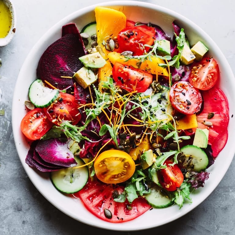 This recipe is genuinely just a starting point. Once you understand the balance—the greens as base, the vegetables as color and texture, the seeds and cheese for richness, the dressing as the final gesture—you can make infinite versions. Replace feta with vegan cheese for a dairy-free version. Add roasted chickpeas for protein. Swap vegetables based on what's fresh. The only rule is that it should look intentionally wild and taste like every element was chosen with care.