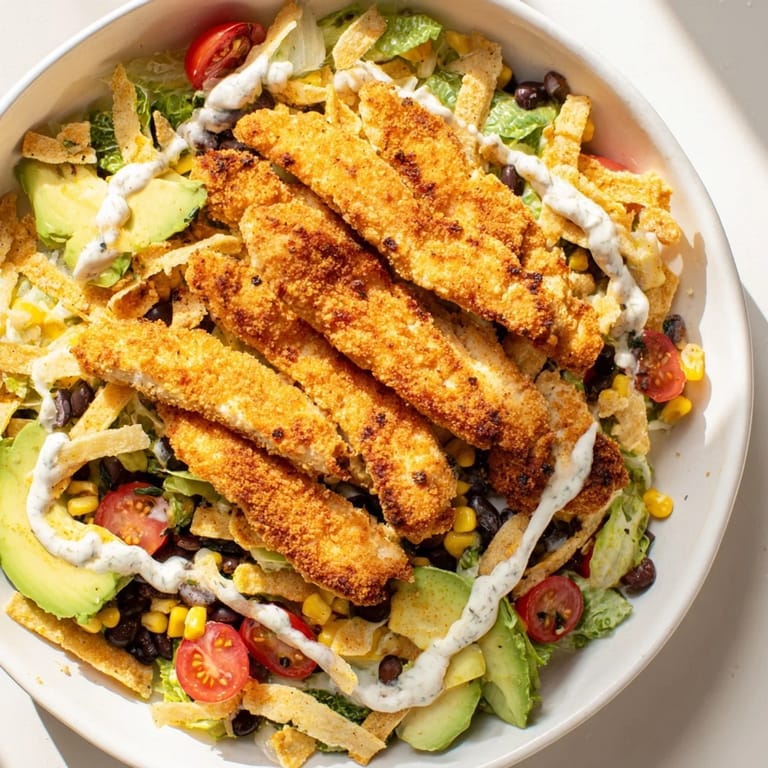 Save to Pinterest My kitchen smelled like a cantina one Thursday evening when I realized I had chicken breasts, half a bag of panko, and zero dinner plans. I started breading and frying without a real plan, tossing spices into the breadcrumbs by instinct. When I piled everything over cold, crunchy lettuce and mixed ranch with leftover salsa from taco night, my partner looked up mid-bite and said, This needs to be on repeat. It's been in our regular lineup ever since.