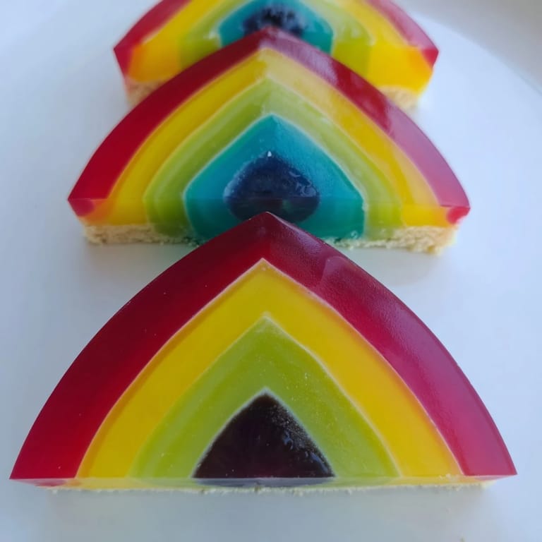 Save to Pinterest The first time I made something this visually ambitious, I was nervous—genuinely worried I'd end up with a muddy brown mess instead of the vibrant kaleidoscope I'd imagined. But the moment those V-shaped segments caught the light, revealing perfect stripes of raspberry red, mango gold, kiwi green, blueberry blue, and blackberry purple, I realized that this dessert wasn't just about taste. It was about that gasp people make when they see something beautiful enough to eat, and then the quiet joy of tasting exactly what they see.