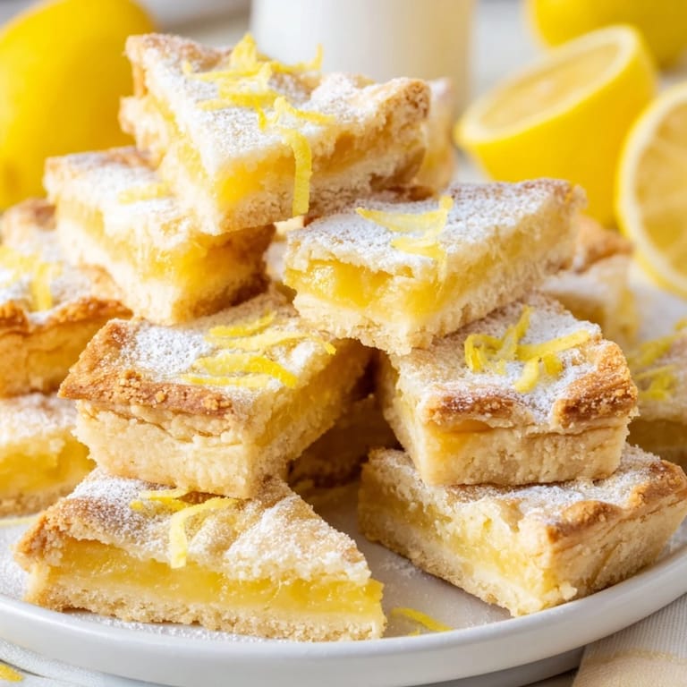 Save to Pinterest Bright, tangy lemon bars with a buttery shortbread crust, cut into elegant triangles for an easy, crowd-pleasing dessert.
