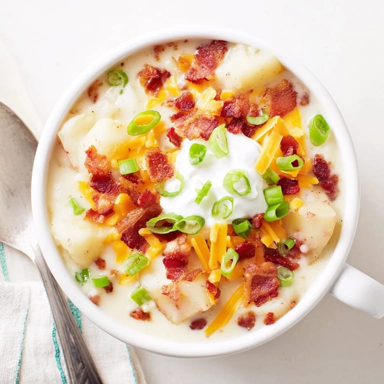 Save to Pinterest A snowstorm howled outside our farmhouse when I first improvised this loaded baked potato soup. The kitchen windows fogged as potatoes baked in the oven, their earthy scent mingling with the sharp aroma of bubbling cheddar. My fingers, cold from bringing in firewood, warmed around the sturdy pot as I stirred. That evening, with wind battering the windows, this soup became our shelter within shelter.