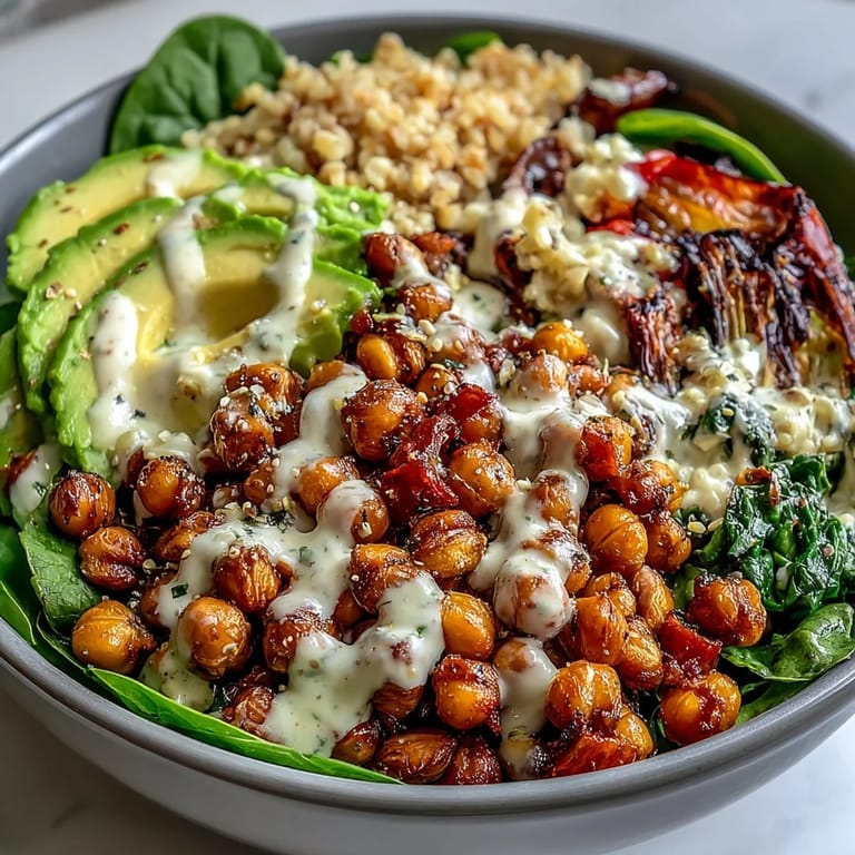 Save to Pinterest The Roasted Chickpea Power Bowl is a vibrant and nourishing meal that combines crispy spiced chickpeas with hearty grains and tender roasted vegetables. This Mediterranean-inspired dish is as flavorful as it is wholesome, making it a perfect choice for anyone seeking a plant-based dinner or a satisfying meal-prep option.