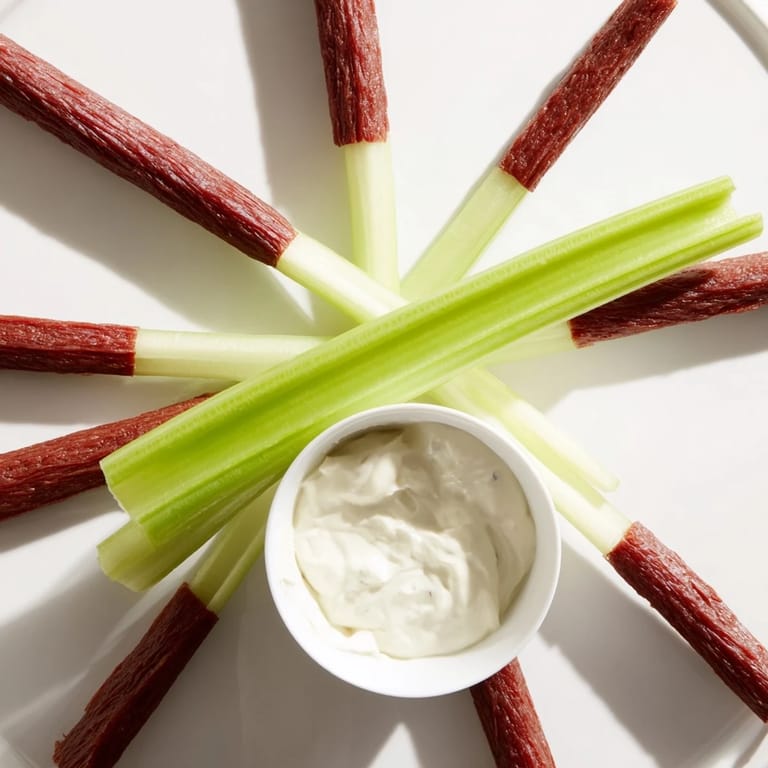 - Fill the gaps between celery with meat sticks, alternating so the eye reads it as a pattern rather than random arrangement. The contrast between light green and dark red makes the whole thing feel almost designed.