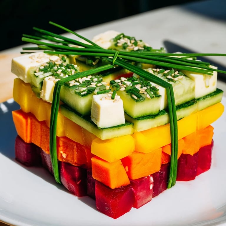 Slice vegetables and cheese into uniform cubes then stack them carefully. Use fresh chive stalks or thin bell pepper strips to tie the stacks gently, securing the layers while adding a decorative touch.